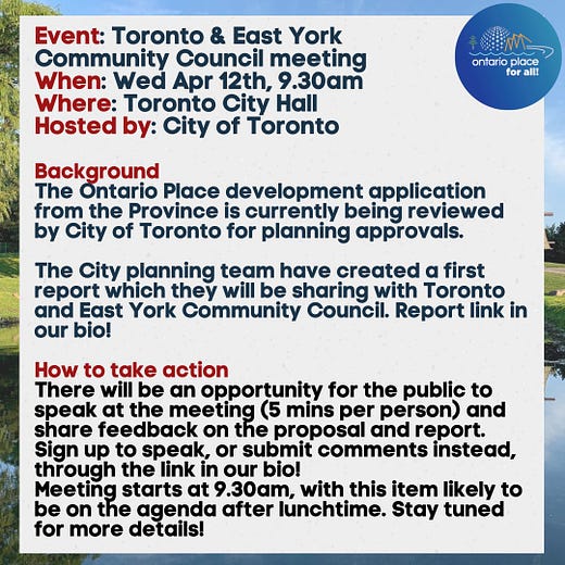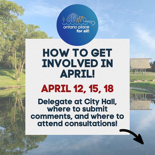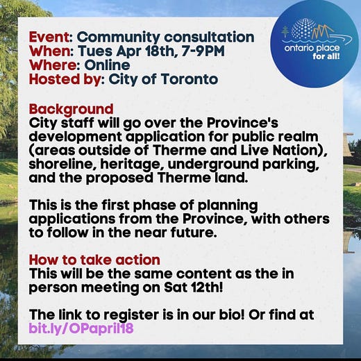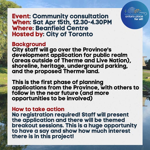 In particular, I will encourage those who are interested in getting involved to check out the community consultations regarding the development application coming up. Ontario Place for All is doing incredible work.